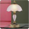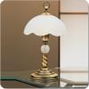 Mosazná stolní lampa má nohu dekorovanou sklem, stínítko je půlkulaté z ledového matného skla.2690 Kč
